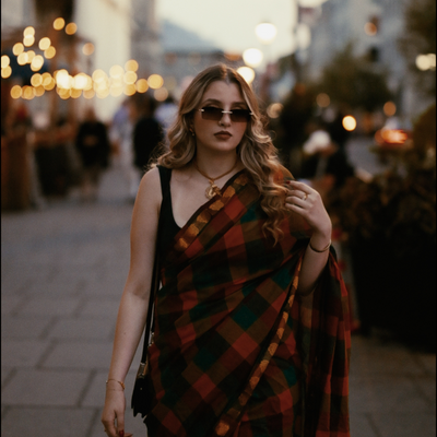 This frame celebrates a vibrant cultural blend, an individual styled in Indian attire, set against a French influenced backdrop in Montreal. The color grading plays a crucial role in unifying these contrasting elements. Warm sculpted highlights enhance the reds, golds, and deep tones of the textile, while carefully controlled shadows preserve depth without overwhelming detail. The subtle earth toned palette connects the subject, the architecture, and the ambient light, allowing the viewer to feel harmony instead of visual noise. Despite diverse influences, environments, and textures, the grade smooths the narrative into a cohesive aesthetic transforming a busy cultural intersection into a poetic visual moment where traditions, geography, and personality coexist beautifully.