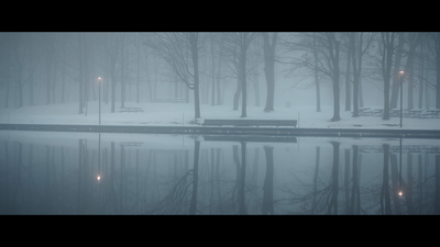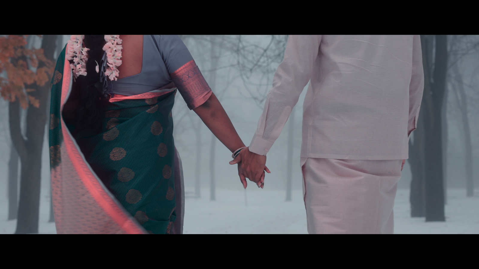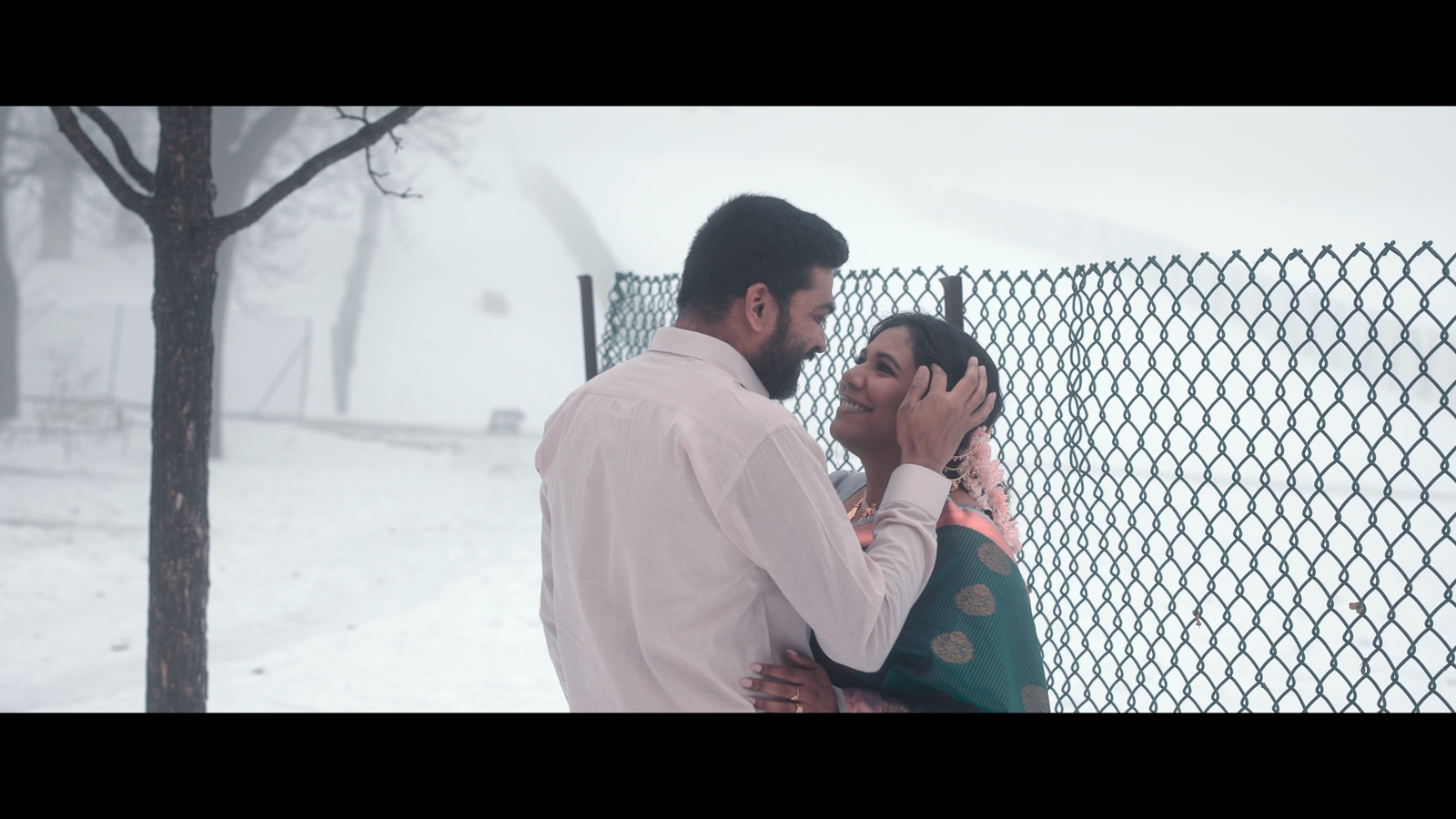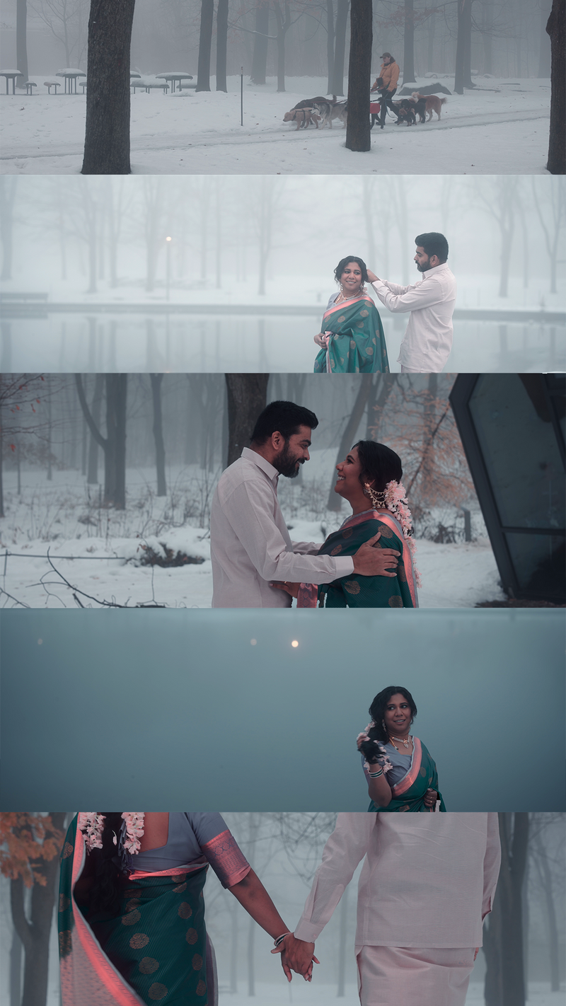 Subtle emeralds, skin tones, blush pink highlights, and soft earth hues were graded to stand against the snow — not overpowering it but breathing warmth into it. The fog flattened the world, but through composition, movement, and palette, the frames evolved into something timeless instead of temporary.