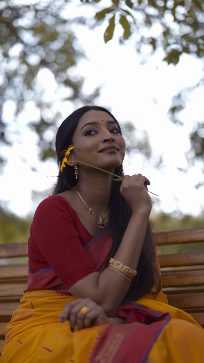 This portrait blends gentle optimism with quiet introspection. Our color grading approach enhances the richness of her red and mustard attire, allowing the tones to bloom naturally while preserving a softly moody atmosphere. The muted background and delicate contrast pull the viewer toward her thoughtful expression — a moment that whispers of dreams and resilience. The flower she holds becomes a subtle metaphor for hope, and through carefully balanced tones and luminance, the image reflects a young woman’s quiet belief in a brighter future.